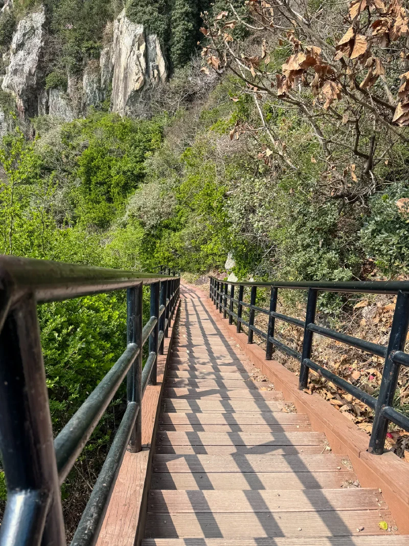 The coastal trail kept going. Rocky cliffs dropping straight into turquoise water. Staircases carved into the hillside. The kind of path where you’re either going straight up or straight down, and every landing has a view that makes you forget you’re out of breath.