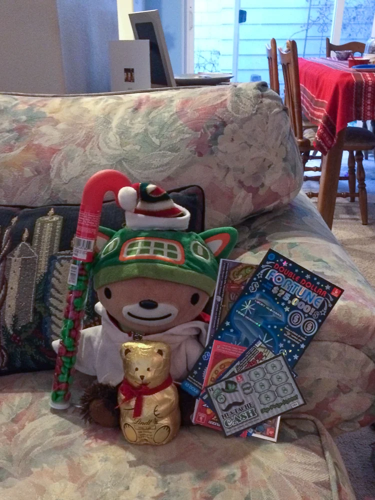 As a pre-christmas gift I got a chocolate bear, scratch tickets and chocolate. I thought I got a pretty good haul. So did Nicholas’ sister.