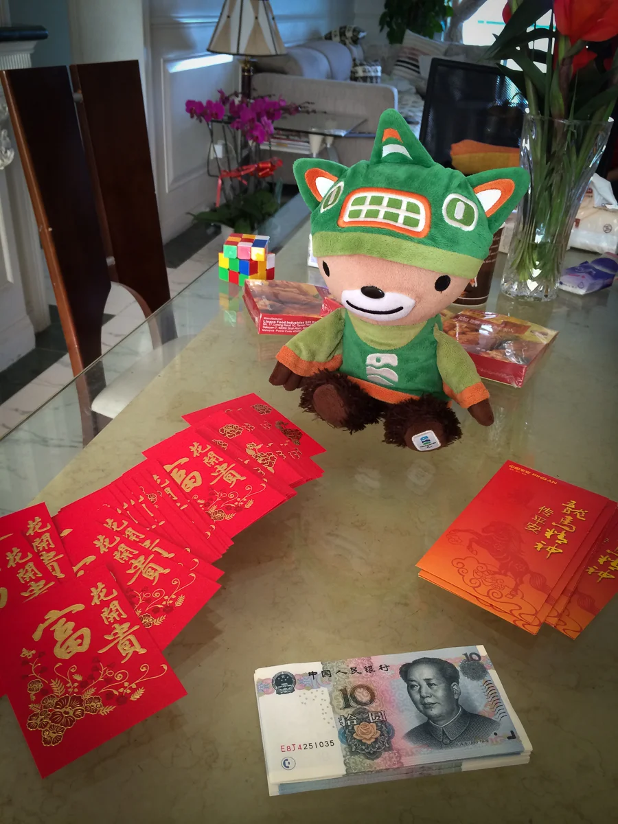 Word in the house was that lai see packages were being prepared. These are auspicious red packets containing money that are given to kids, colleagues and baby bears like me.