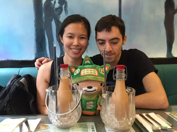 We started off by making sure we had enough energy for the hike. For Nicholas that meant getting some champagne Chinese milk tea. It sounds all fancy and has SUCKER written all over it. It just meant bottles of tea stuck in a bucket of ice at a $10 premium.
