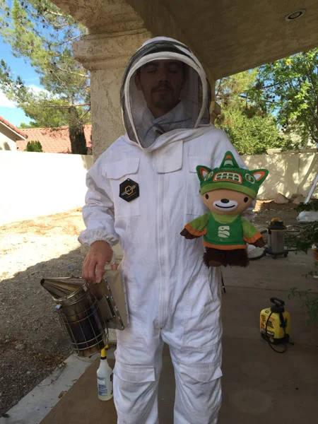 The latest invasion happened in the roof. So my bud got a bee suit and tried to smoke them out