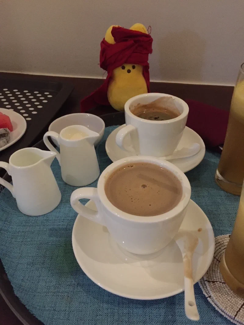 We’re posing for our bon voyage photo on the ship deck when I hear a noise. Peep! Peep!! Oh no. Yep, there’s that bunny. It’s a cadre of people myself and an unwelcome bunny. I don’t know how he manages to do it. I try to lock him in the safe but he somehow manages to get out and have coffee. I just don’t even….