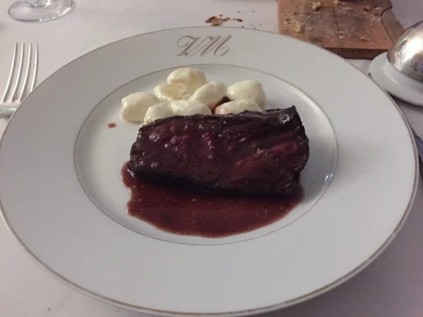 And then the mains. By now Nicholas was already past full. And then they gave him this much beef, followed by a whole little pot full of creamy gnocchi. He was on his own on that one. Not. My. Thing.