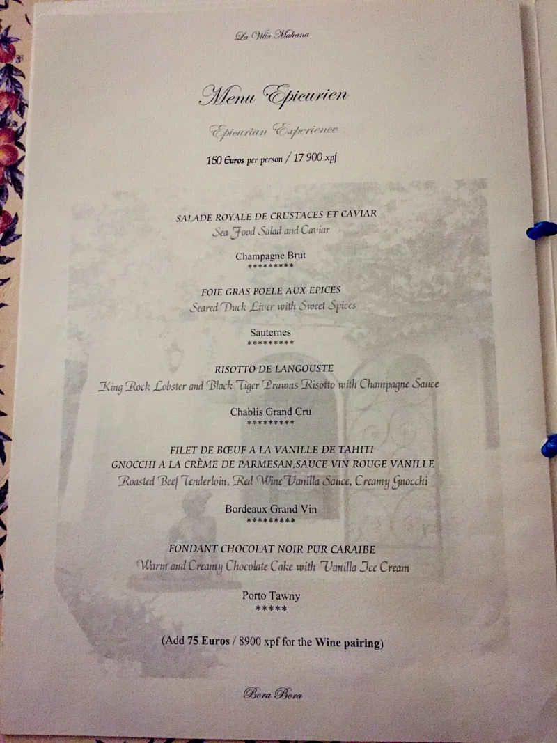 Villa Mahana is supposed to be expensive. And it wasn’t cheap. The multi course meal was €150 plus wine paring. But everything in Bora Bora is expensive. Our pizza was $50 and dinners averaged $150 anyway, so this didn’t feel much different. Plus the quality was comparable to the same price dinners we’d pay back home. This is not to say I approve. I’d rather this money be invested in my gaming rig. But just to say it wasn’t really that pricey comparatively.