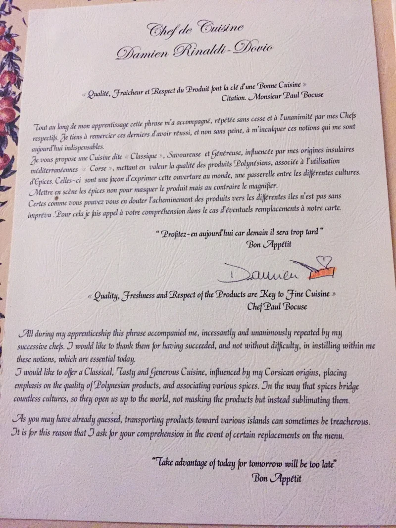 Tonight we left our resort for the first time to try one of the top restaurants in Bora Bora, Villa Mahana. Villa Mahana is a restaurant owned by Chef Damien Rinaldi-Dovio, a Corsican chef that was trained in Paris, became executive chef at L’Orangerie in LA before moving to Bora Bora something like 12 years ago. Villa Mahana serves mostly French food with Polynesian influences, or as Pokin’s hairstylist explained, more like “French food with Polynesian sized portions.”