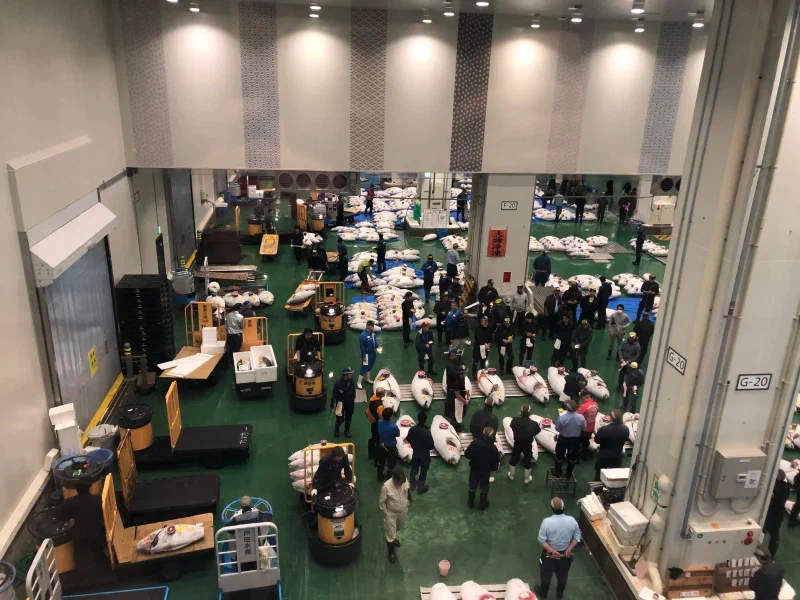 For some reason that shall never make any sense to me, Pokin really really wanted to see the Tuna Auction. The auction used to be at the Tsukiji Market, where you actually were able to walk right up amongst the Tuna. The place got too crowded, so they eventually moved it to a more modern larger facility at the Toyosu market. Instead of being right in the middle of the action, you now had to stand behind glass walls to see it, and entry required applying to a lotto.