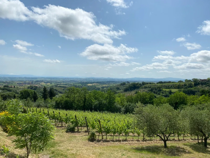 Podere Le Berne sits on a hillside about fifteen minutes from the villa. The kind of place where the vineyard rows run right up to the front door and the views go on forever.
