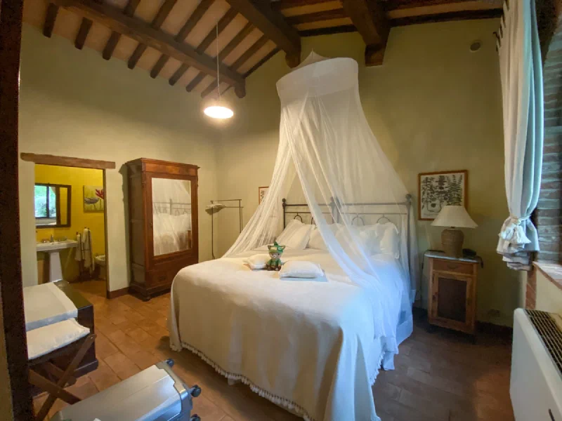 The room had terracotta floors, exposed beam ceilings, an iron-frame canopy bed with white linens, and an antique wardrobe that looked like it had been there since someone important lived in this place. Which, given that it’s a Tuscan villa, was probably several centuries of important someones.
