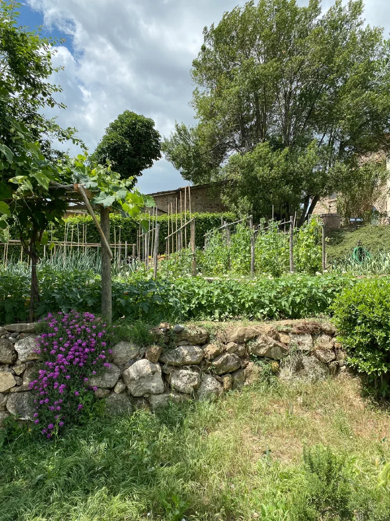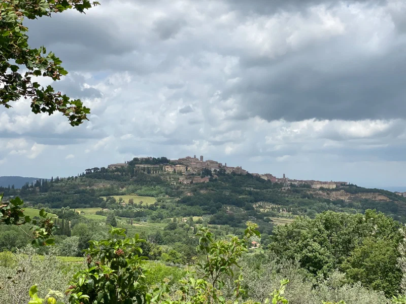 The vineyard had a little garden, neat rows of vines running down toward the valley, and that view of Montepulciano up on its ridge that makes you understand why people have been making wine in this exact spot for centuries.