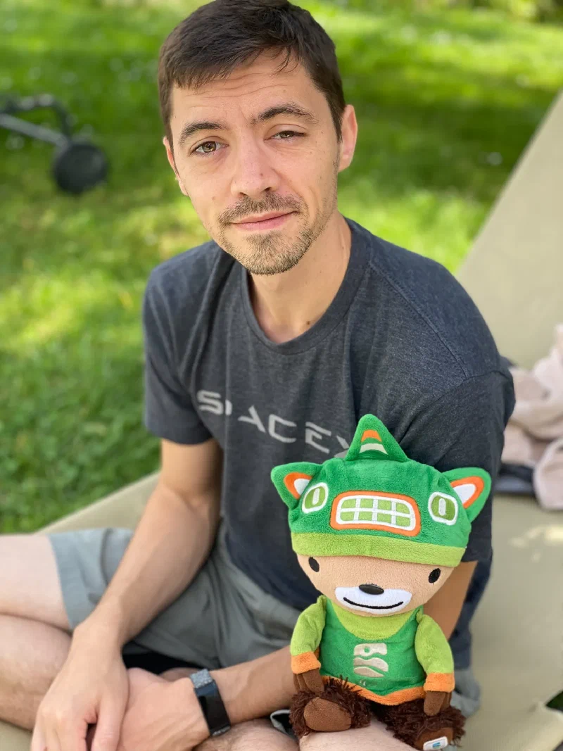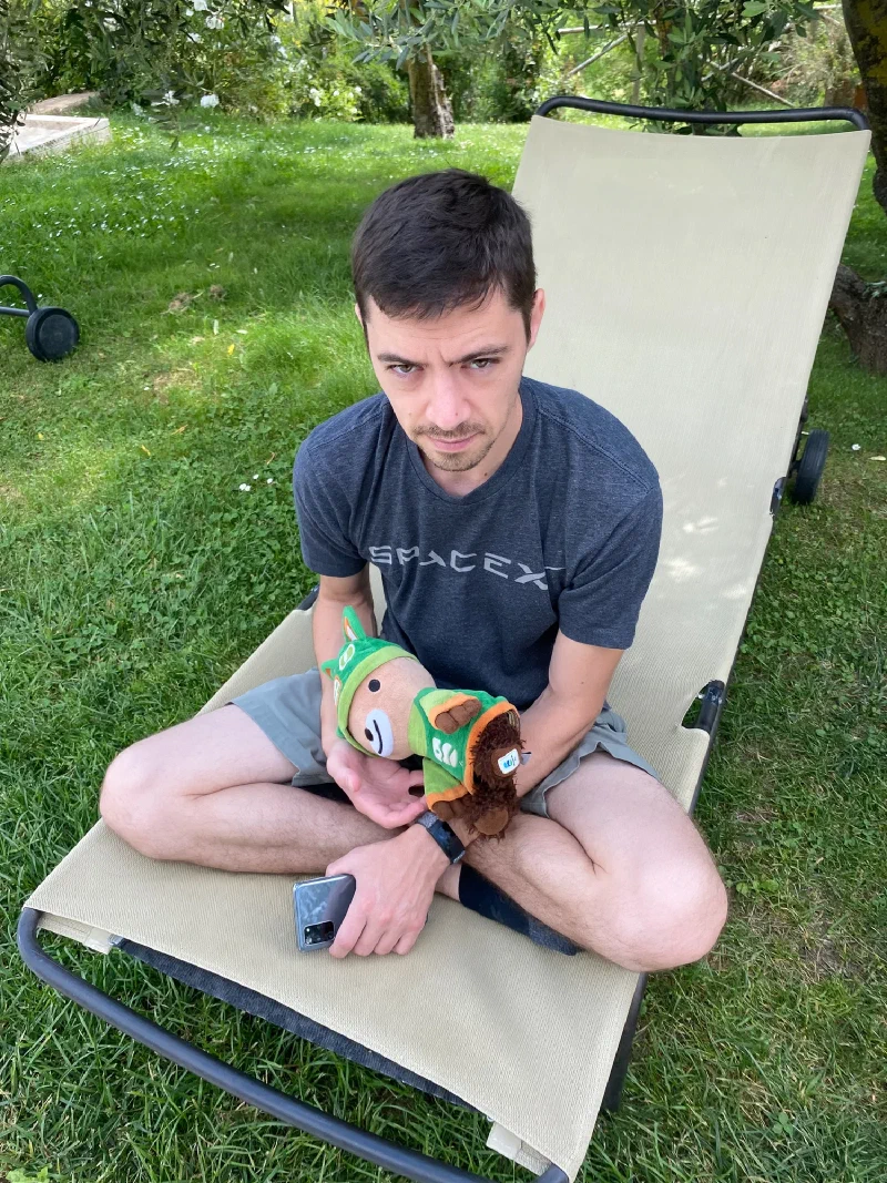 Nicholas was in his SpaceX shirt, lounging under the olive trees, scrolling his phone. Pokin was somewhere being productive. I supervised from the lounger. Dry.