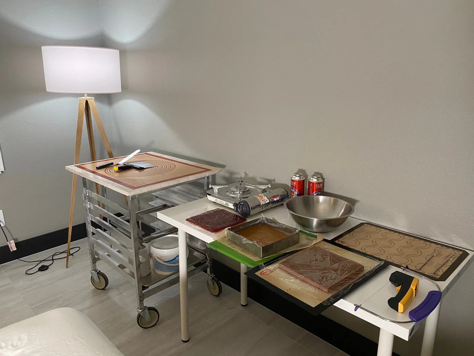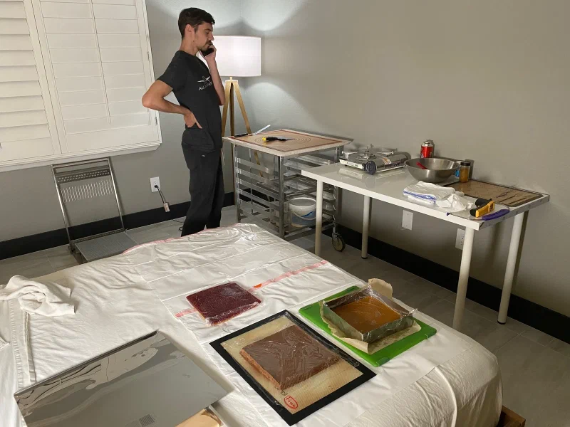 Alas it’s already hot in Vegas, so my bud had to set up production in a bedroom where he could drop the room temperature sufficiently to make fine cocoa products.