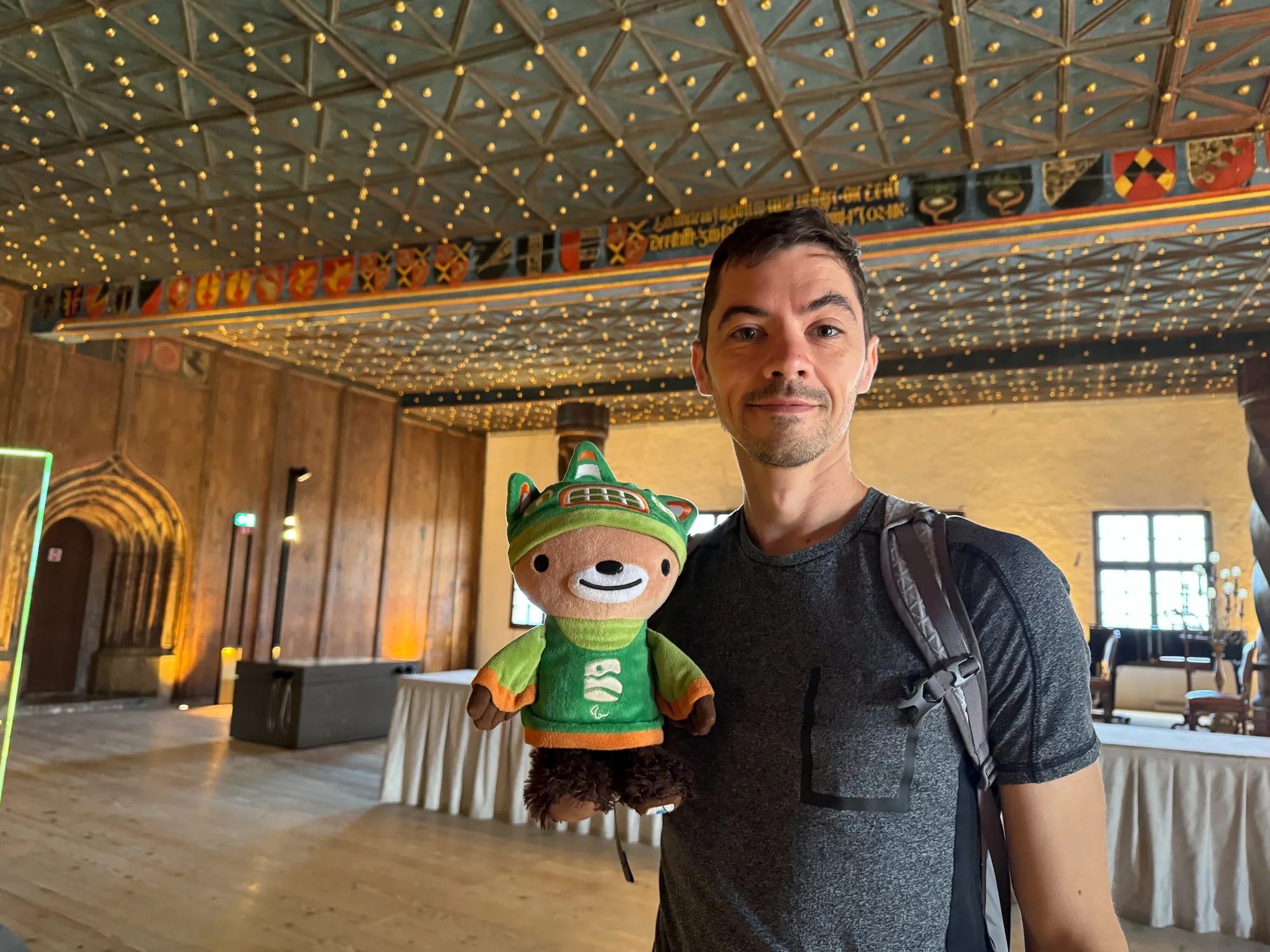 The Golden Hall had a blue coffered ceiling studded with hundreds of gold bosses meant to look like a starry sky. Gothic wood paneling, heraldic crests, long white-linen tables. The Prince-Archbishops who lived here were supposedly men of God. They had very expensive taste in ceilings.
