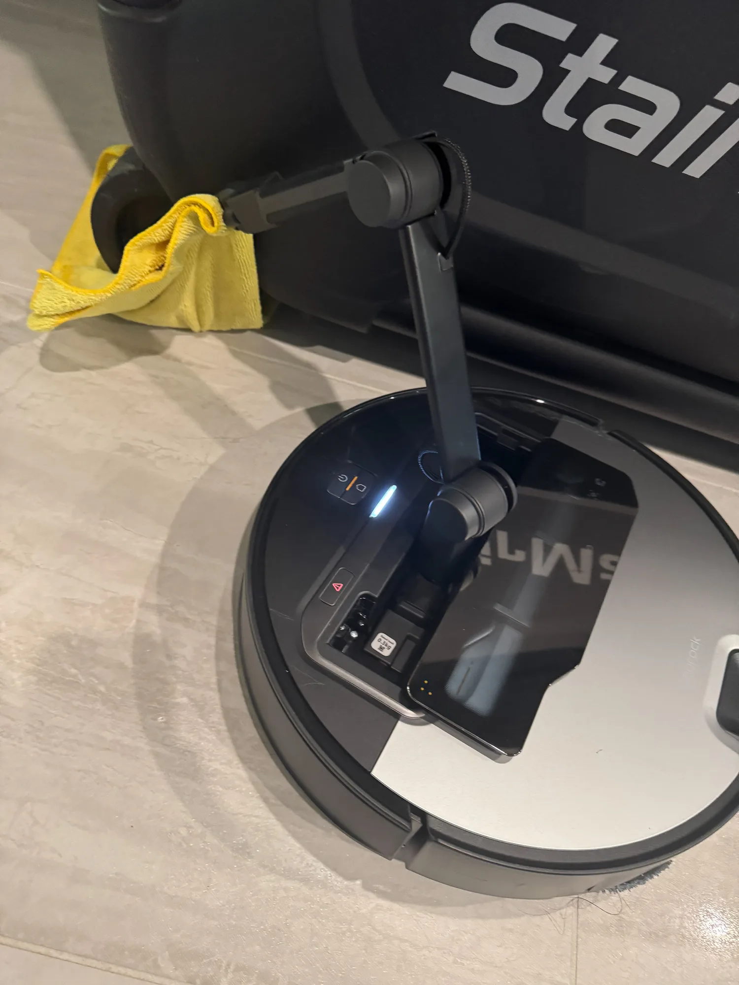 It decided the rag needed to be moved. It extended its arm, grabbed the rag, and pulled. The StairMaster did not move. The Roborock did not care. It locked in. Lifted itself off the ground. Pulled harder. The arm was fully committed to removing this rag from under a 600-pound machine that was not going anywhere.